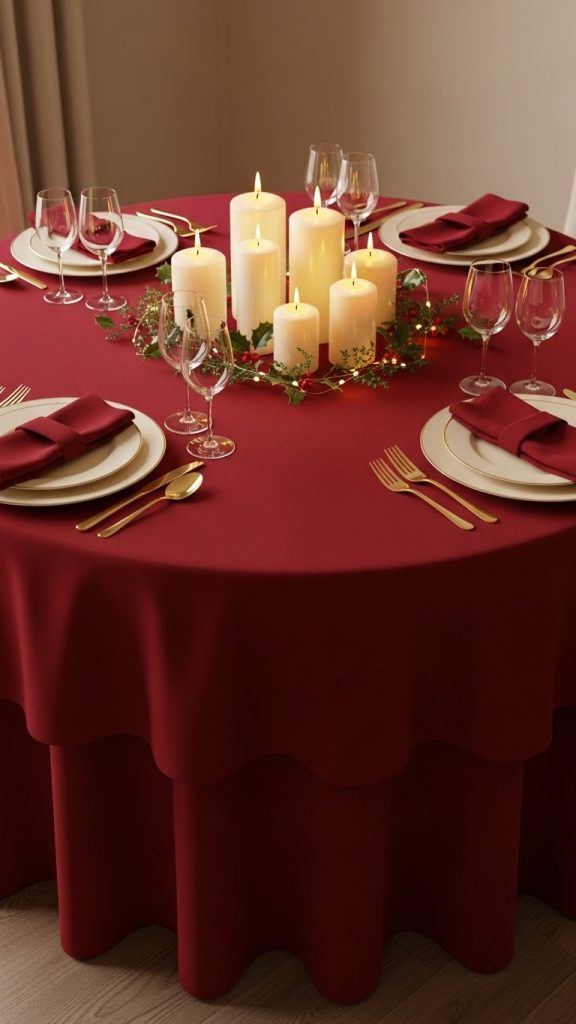 A candlelit Christmas table emphasizes intimacy and warmth, perfect for smaller gatherings or family dinners. Use a deep red, burgundy, or cream tablecloth. Centerpieces should feature multiple candles of varying heights in clusters, with small greenery or holly accents.