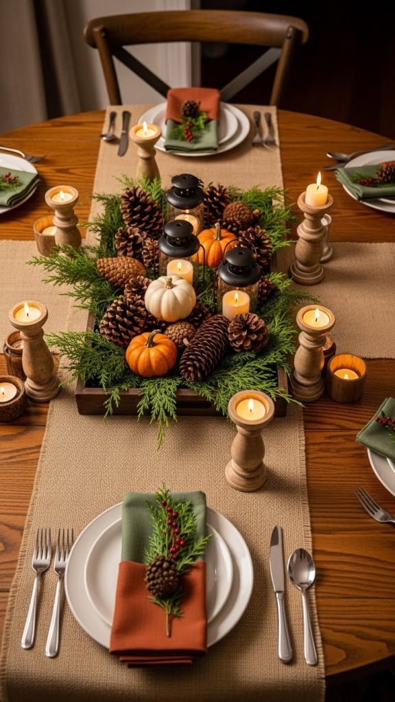 A rustic woodland theme brings the outdoors inside, offering a cozy, natural ambiance. Use a neutral linen tablecloth or a wooden tabletop exposed for a more authentic rustic feel. The centerpiece can consist of a wooden tray filled with pinecones, evergreen sprigs, small pumpkins, and lanterns.