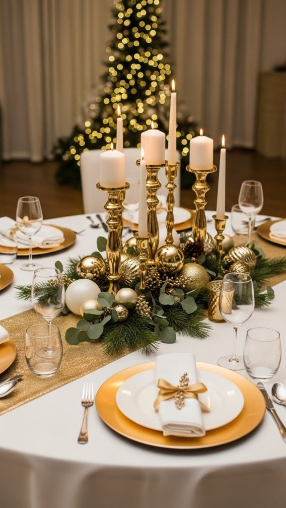 For a luxurious Christmas table, gold and white are a sophisticated combination. Start with a white tablecloth and pair it with a gold table runner or placemats. Centerpieces can include gold candlesticks, white candles, and metallic ornaments.