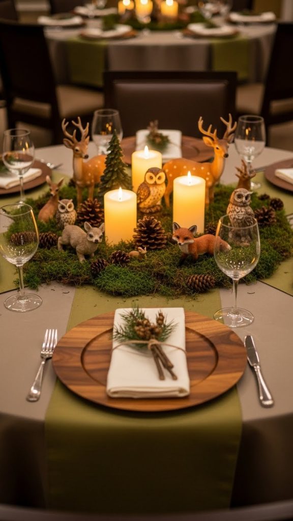 Bring the magic of the forest indoors with a woodland animal-themed Christmas table. Use a neutral tablecloth, like beige or moss green, and create a centerpiece with small animal figurines such as deer, owls, or foxes among pinecones, moss, and candles.