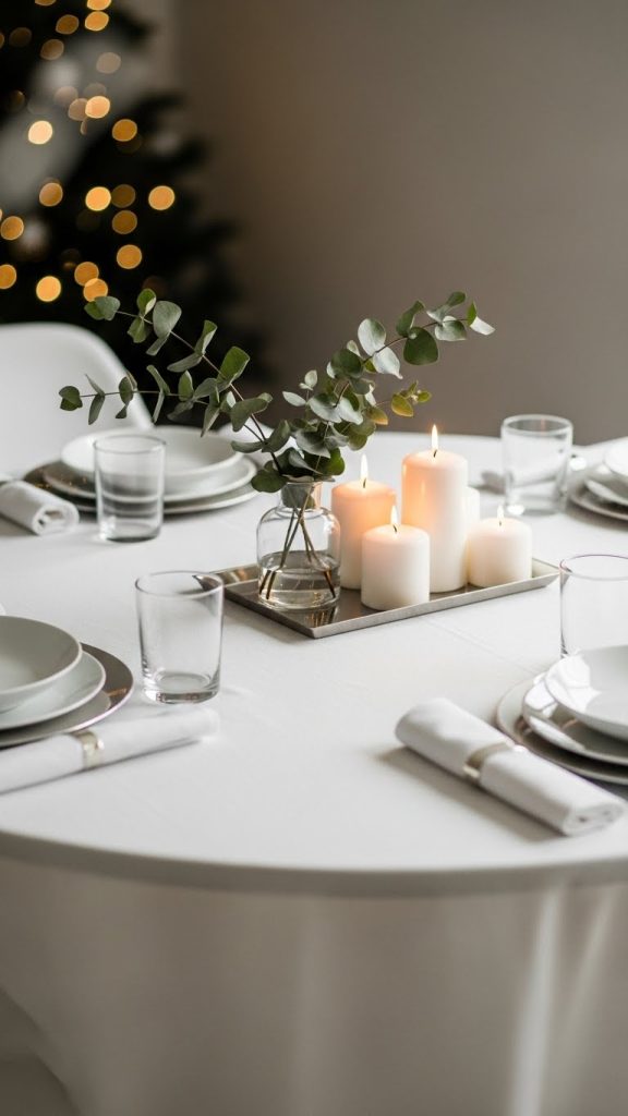 Materials needed include a white or cream tablecloth, vase, eucalyptus branches, candles, simple tray, white plates, and minimal metallic accents. Preparation involves ensuring all elements are proportional to the table size, preventing a cluttered appearance. This style works well on round tables as it maintains openness while still offering a festive atmosphere.
