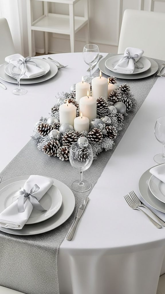 Centerpieces can include white candles of different heights surrounded by faux snow, pinecones, and silver ornaments. Incorporating small crystal or glass accents can further enhance the frosty, reflective quality of the dรฉcor. Place settings can use white plates with silver chargers and napkins tied with silver ribbons or miniature pinecones.