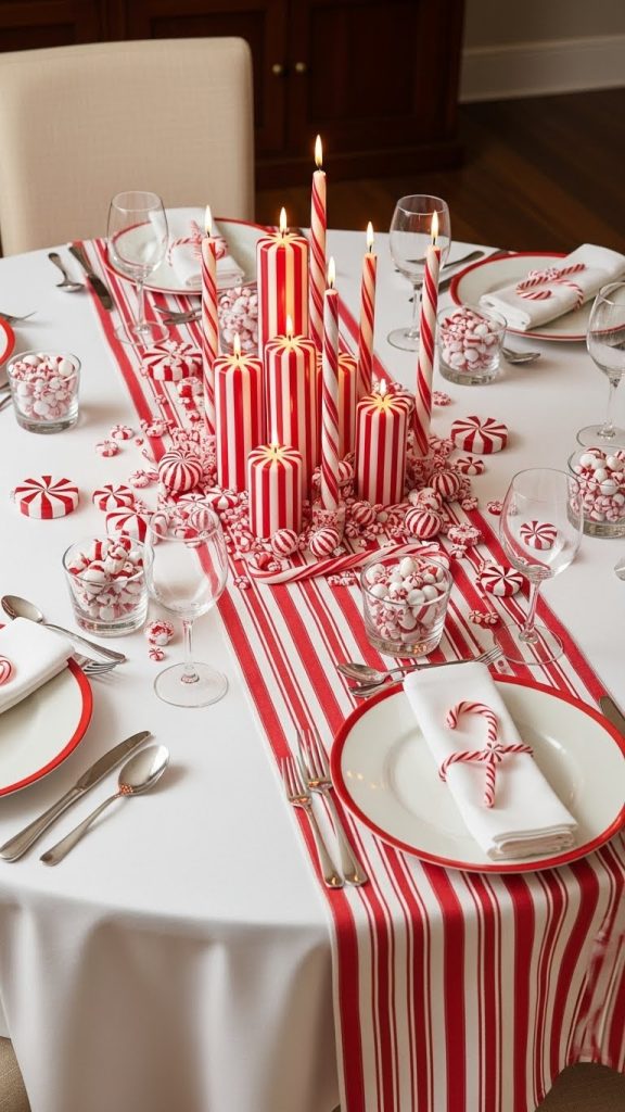 A playful candy cane-inspired dรฉcor can energize the holiday table. Use a red or white tablecloth and complement it with striped runners mimicking candy cane patterns. The centerpiece can include red and white striped candles in a circular tray surrounded by candy cane clusters or peppermint ornaments.