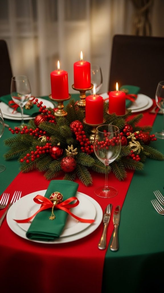For the centerpiece, consider a mix of pine branches, red berries, and small ornaments arranged in a low vase. Surround it with candles of varying heights in red and gold holders to bring warmth to the table. Each place setting can feature green napkins tied with red ribbons and a small ornament or sprig of holly.