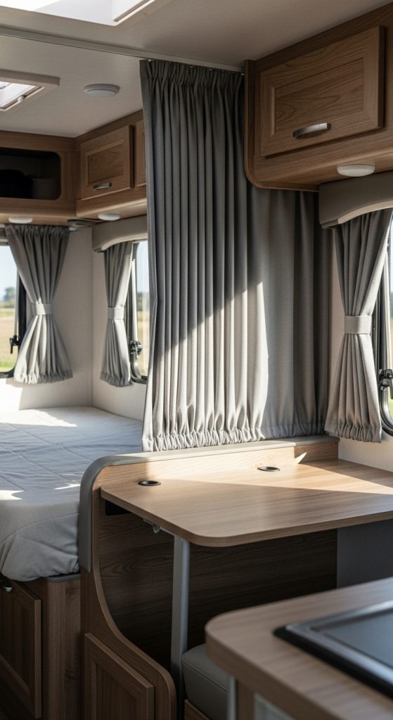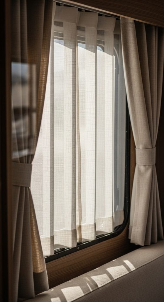Sheer curtains are lightweight and semi-transparent, providing a balance between privacy and natural light. They allow sunlight to brighten your RV interior while softening the view from outside. These curtains are ideal for areas where complete darkness is not necessary.
