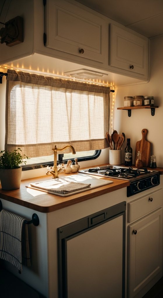 Cafe curtains cover only the lower portion of the window, allowing light to enter from the top while maintaining privacy at eye level. This style is particularly charming for small RV kitchens or breakfast nooks.