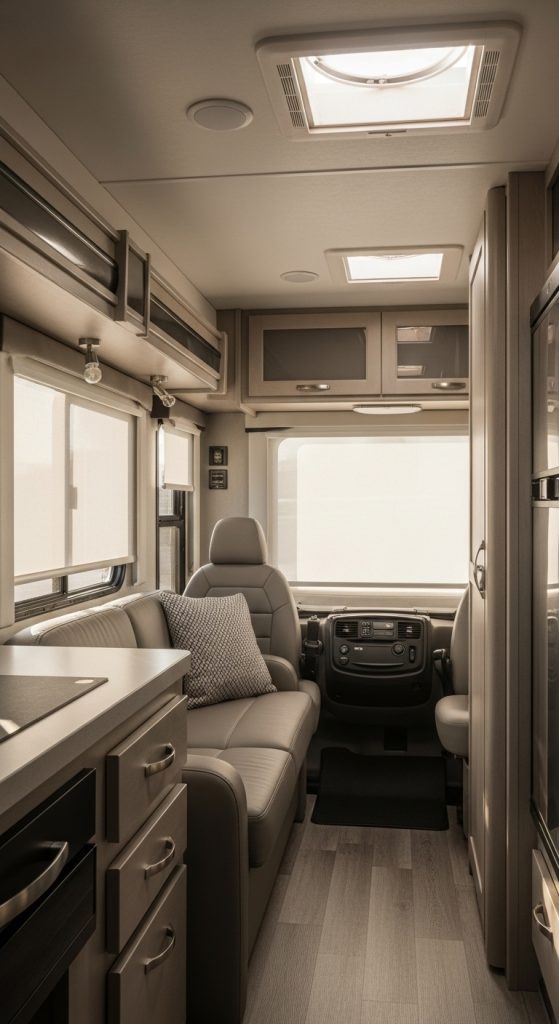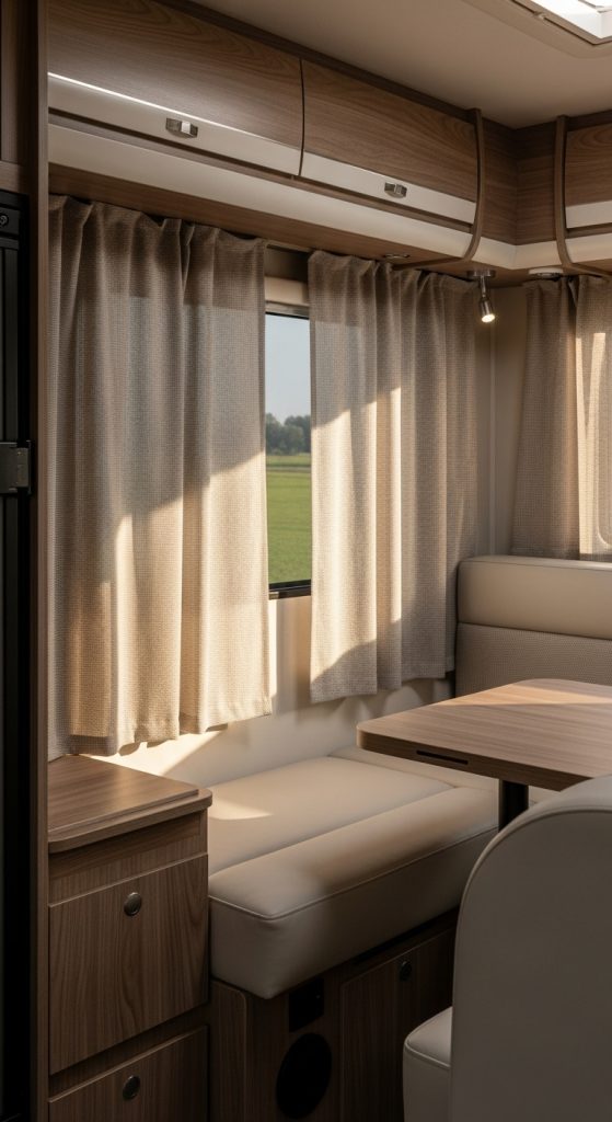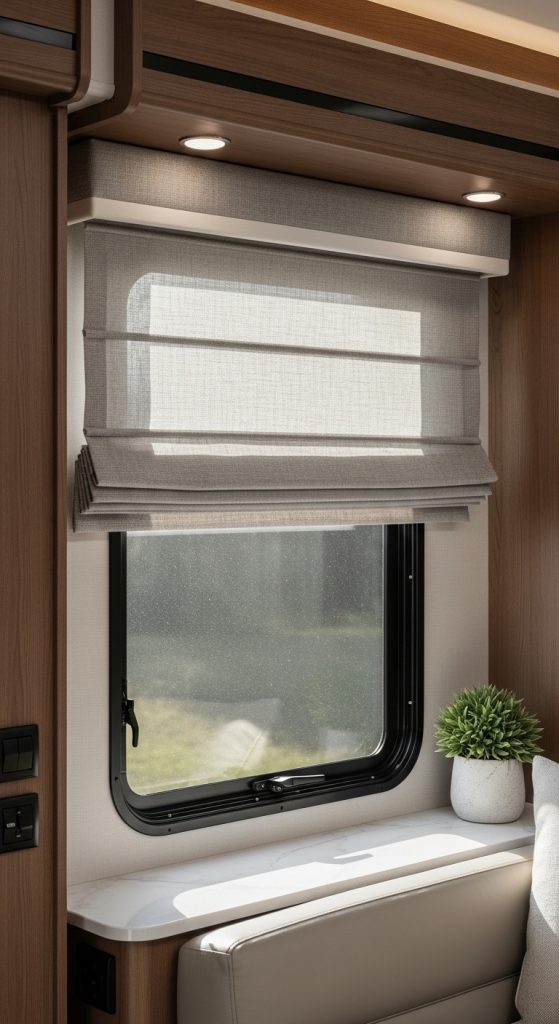 Roman shades offer a structured and elegant alternative to traditional curtains. They fold neatly when raised and provide a sleek appearance when lowered. This style is perfect for RV owners seeking a polished look without sacrificing functionality.