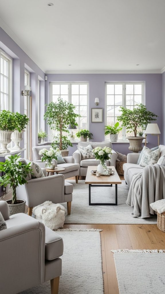 Soft lavender pairs well with white furniture, silver accents, and soft textiles. It is ideal for reading, crafting, or relaxing. This color adds personality while remaining calming and light.
