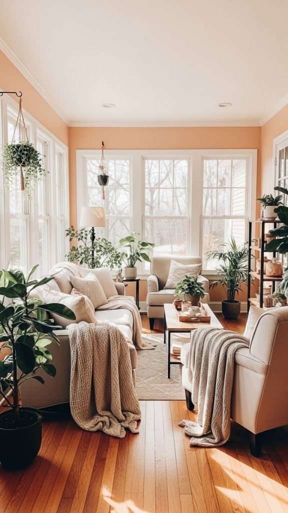 Soft peach is a warm and subtle color that adds character to a sunroom. It reflects sunlight in a flattering way, creating a gentle glow that feels inviting and unique.