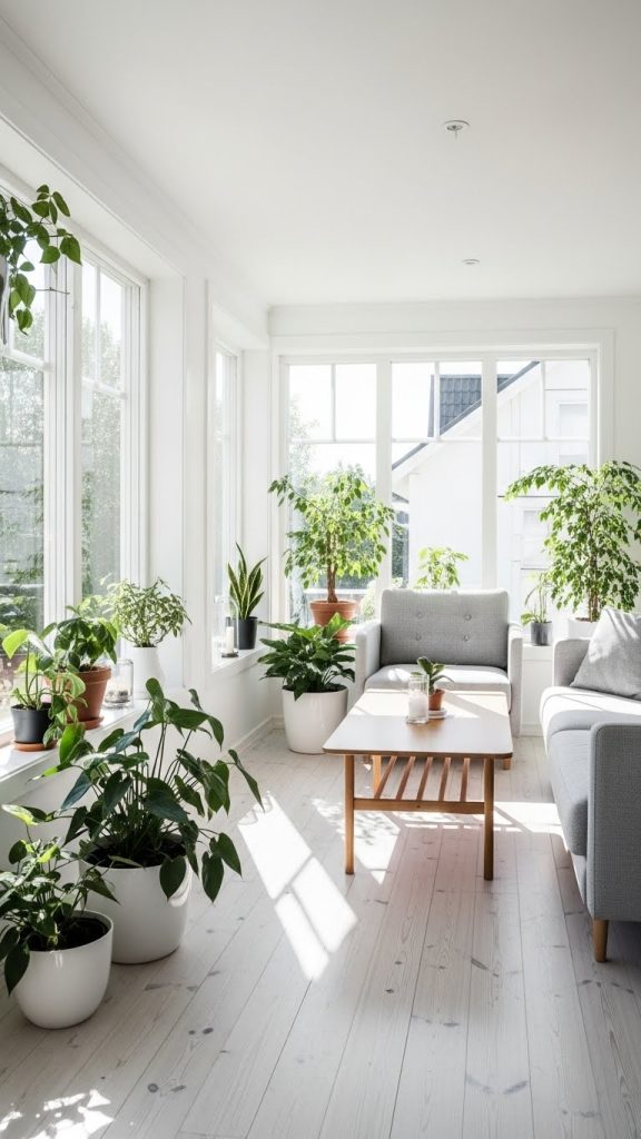 Pale gray pairs beautifully with white trim, black accents, and metallic finishes. It also allows colorful furniture and artwork to stand out. To keep the space from feeling too cool, add warm textures such as wooden furniture, woven baskets, and soft fabrics. This color choice is perfect for homeowners who want a modern, elegant sunroom that feels fresh without being overly bold.