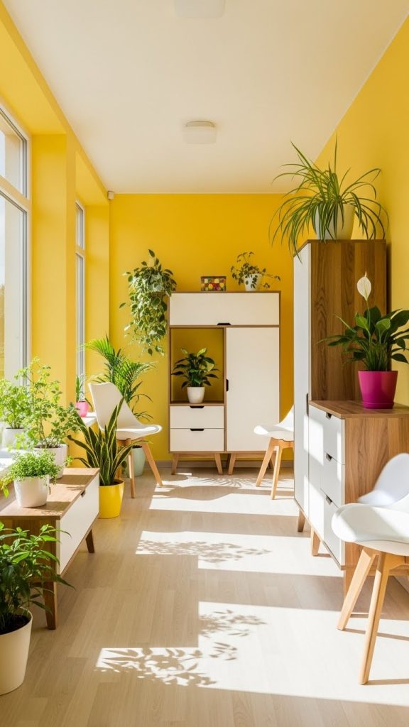 Creamy yellow pairs well with white trim, light wood furniture, and soft gray accents. It is ideal for sunrooms used for breakfast, family gatherings, or hobbies. This color adds energy while still feeling comfortable and gentle.