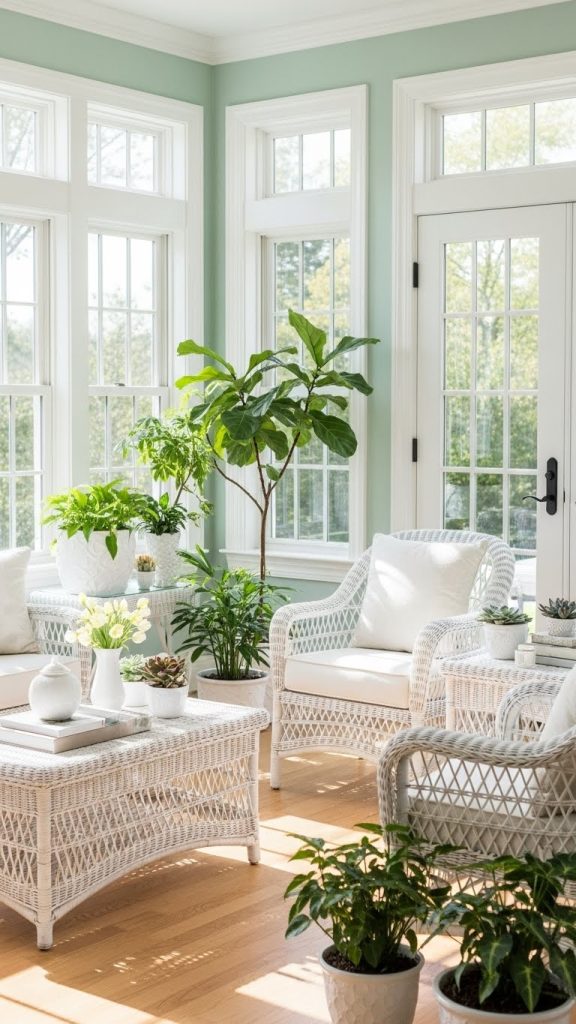 Soft white pairs well with almost any furniture style. Natural wood furniture, wicker chairs, and light fabric cushions look especially beautiful against white walls. Add texture through rugs, throw pillows, and indoor plants to prevent the room from feeling plain. This color choice is perfect for homeowners who want a clean, elegant, and flexible sunroom design that can be easily updated over time.