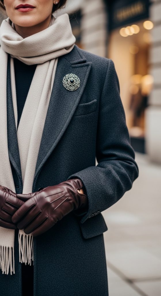 These subtle details show attention to style and craftsmanship. A brooch can make a plain blazer sophisticated, while leather gloves lend a polished, timeless appeal.