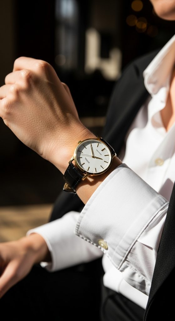 For formal settings, opt for a leather strap or metal band in neutral colors like black, gold, or silver. For casual days, a minimalist or fabric-strap watch adds a relaxed feel.