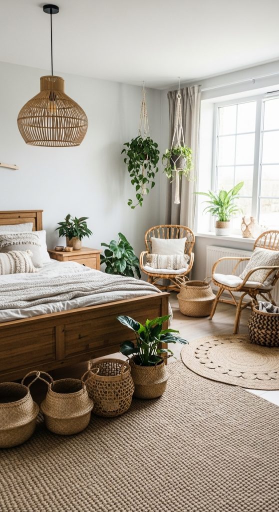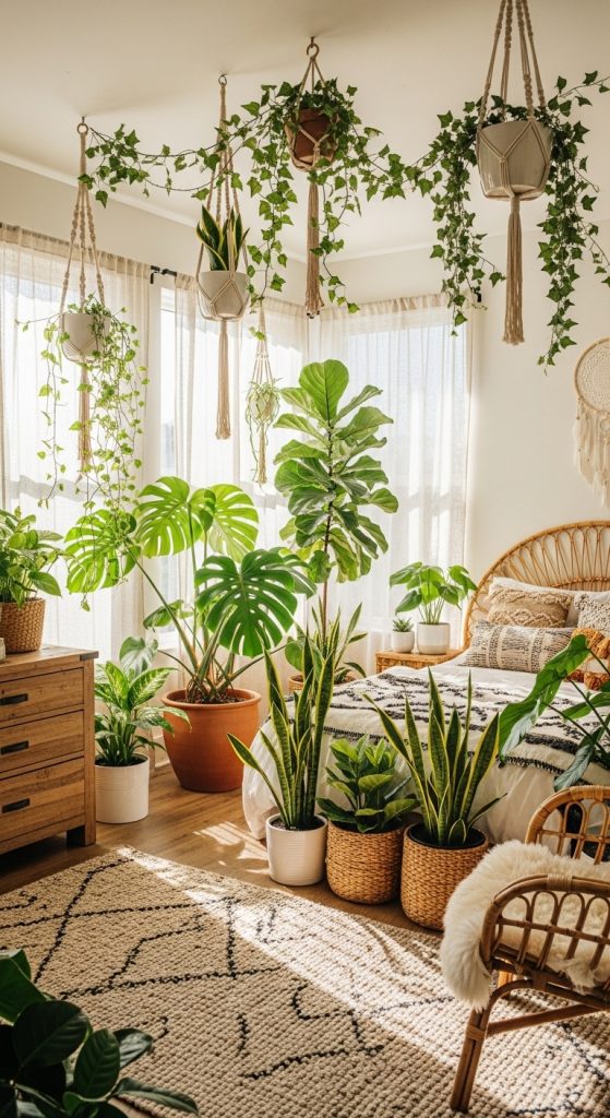 Display plants in woven baskets, ceramic pots, or macrame hangers to keep the natural aesthetic. The presence of greenery promotes a calming atmosphere and connects your bedroom to nature, an essential element of boho design.