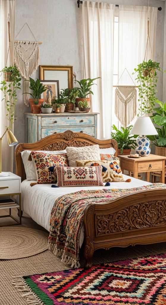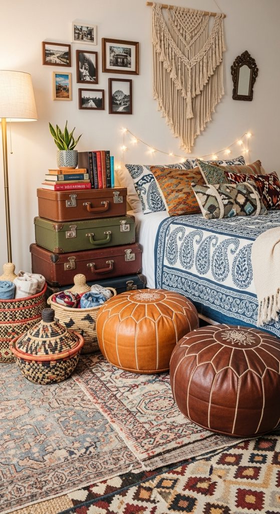 Think Moroccan poufs, Indian block-printed textiles, or African baskets. Vintage suitcases can be repurposed as nightstands, and antique mirrors bring a timeless charm. By mixing global influences, your bedroom becomes a reflection of both style and storytelling.