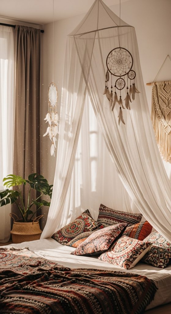 Nothing says boho chic like draped fabrics and bed canopies. Sheer curtains or lightweight textiles hung above the bed create a dreamy, romantic feel.