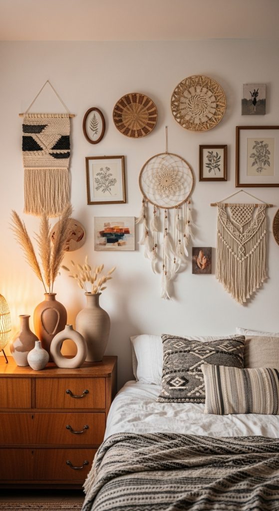 Handmade items bring authenticity to a boho chic bedroom. Consider adding woven wall hangings, pottery, or macrame art. Dreamcatchers, handmade baskets, or textile wall art can also add personality.