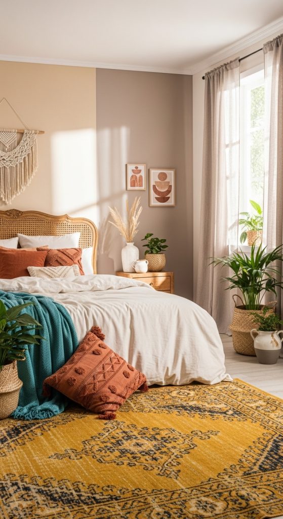 Colors like terracotta, mustard, teal, or deep burgundy work beautifully in a boho setting. Mixing neutrals with vibrant accents creates balance, keeping the space grounded yet lively.
