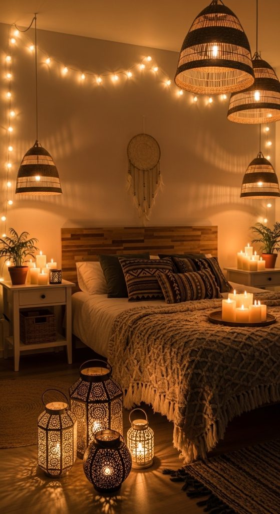 Lighting plays a key role in creating a boho chic atmosphere. Instead of harsh overhead lighting, opt for soft and cozy options. String lights, lanterns, and floor lamps with woven shades create a warm and inviting glow.