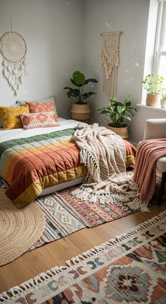 Choose earthy colors or vibrant patterns inspired by global textiles. Moroccan rugs, kilim throws, or handwoven blankets can bring authenticity and charm. Layered textiles not only add visual interest but also create a cozy, lived-in feel.