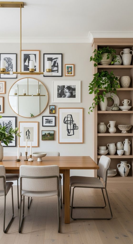 The walls of the dining area should not be overlooked. Artwork can create a strong visual impact, whether through large framed prints, paintings, or a gallery wall of smaller pieces. Mirrors are another popular choice because they make the space feel larger and reflect light beautifully.