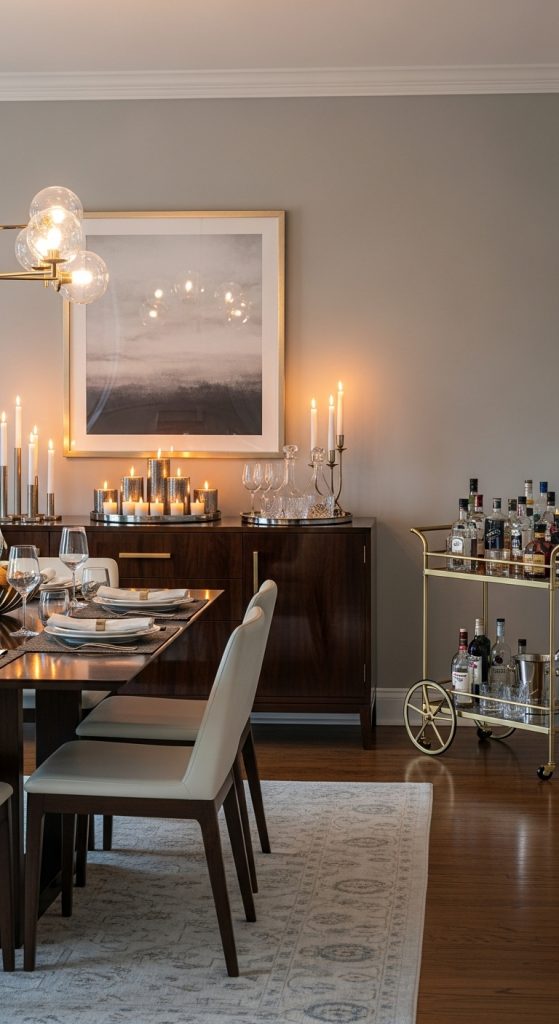 Practical furniture such as sideboards, cabinets, or bar carts adds both functionality and decor. Sideboards are excellent for storing dishes, cutlery, and linens while also providing a surface for decorative objects.