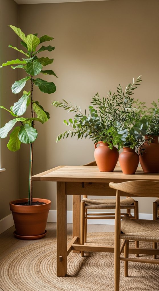 Natural elements such as wood, stone, or wicker add warmth and texture. A wooden sideboard, a rattan light fixture, or stone coasters can subtly tie the room together. Combining greenery with natural textures creates a calming and inviting atmosphere.