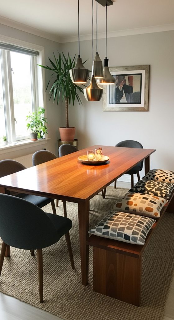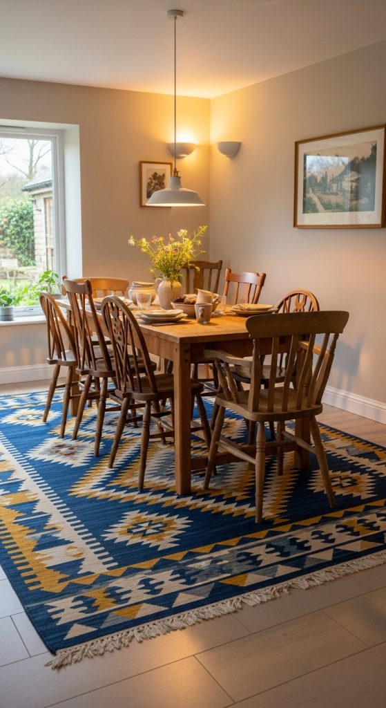 Adding a rug under the dining table not only adds warmth but also defines the space. This is especially effective in open-plan homes where the dining area flows into the living room or kitchen. The rug should be large enough for chairs to remain on it even when pulled out.