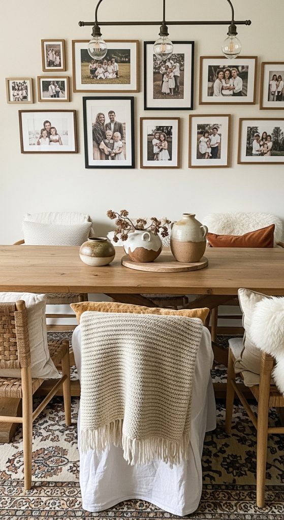 For a more textured and dimensional look, consider wall paneling, shiplap, or wallpaper with subtle patterns. Floating shelves can be used to display ceramics, family photos, or decorative plants. The right wall decor makes the dining area feel complete and adds layers of personality.