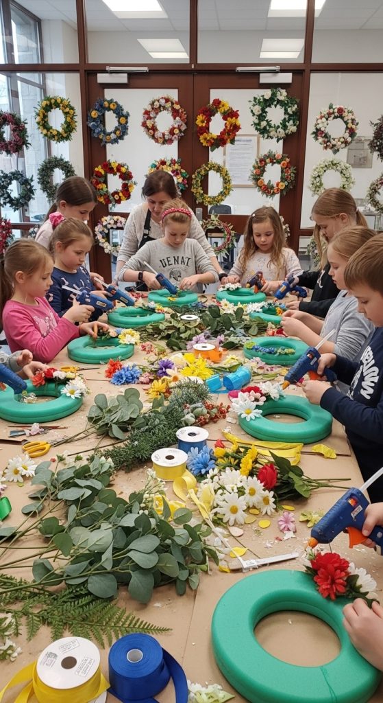 Hot glue and floral wire allow pieces to be attached securely. Wreaths can be themed for winter, spring, summer, or fall, or customized for holidays.