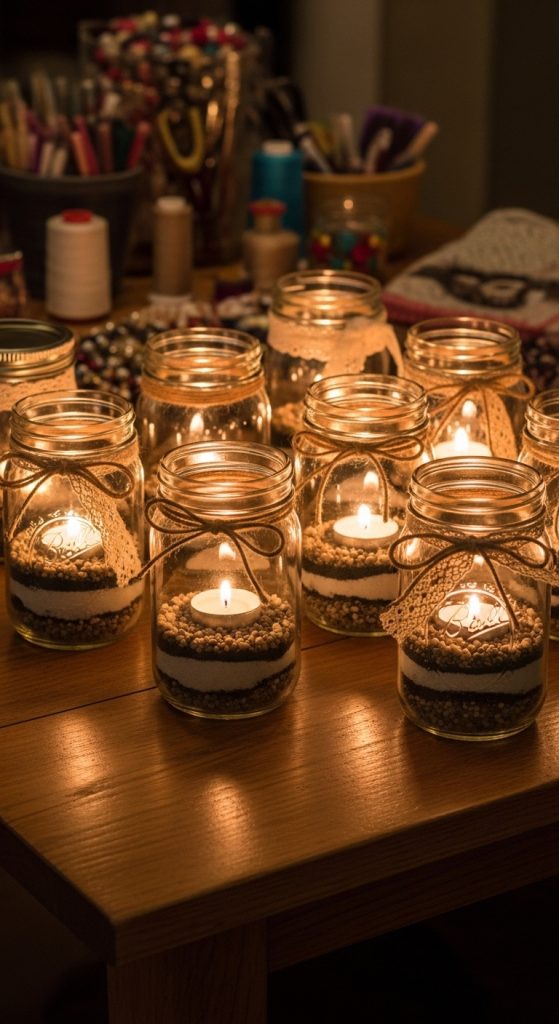 For a more personalized touch, jars can be painted, frosted, or wrapped with twine, ribbon, or lace. These DIY candle holders provide ambient lighting and add charm to any room.
