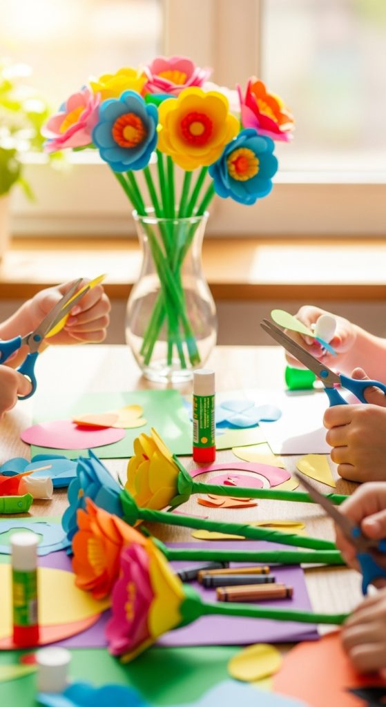 Paper flowers are cheerful crafts that brighten any room. Children can make simple flowers or more detailed layered designs depending on their age and skill level.