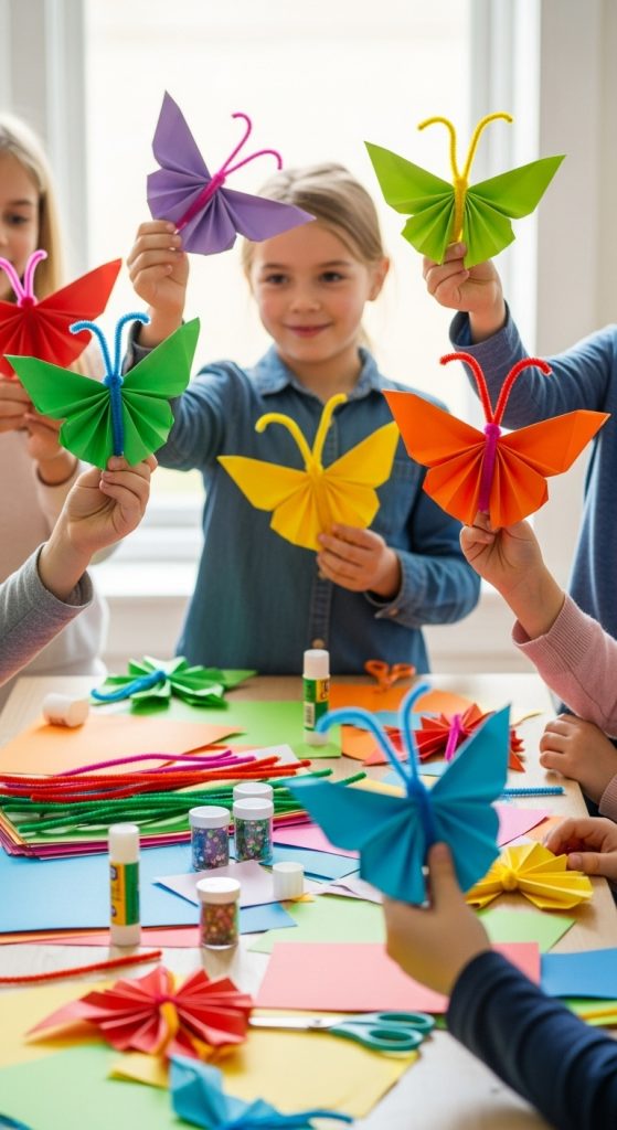 Colorful paper butterflies are simple to make and can be used as wall decorations, bookmarks, or small gifts.