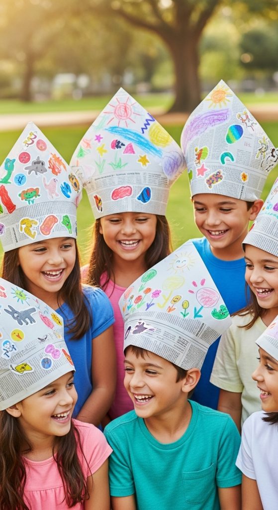 Benefits: Kids enjoy wearing the hats after making them. This activity supports imaginative play while teaching basic folding skills.