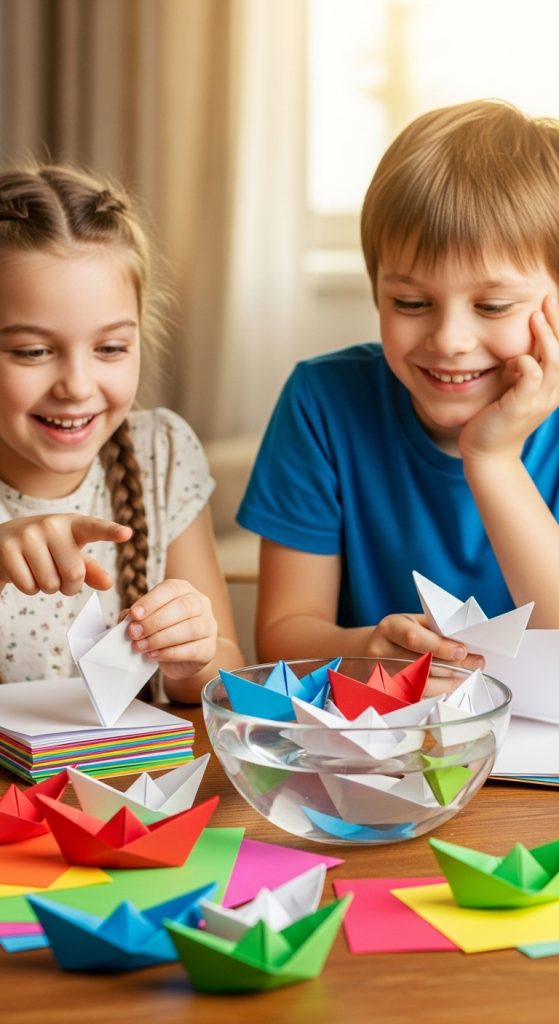 Benefits: Kids learn patience and focus while practicing folding techniques. Floating the boat in a bowl of water adds excitement and a basic introduction to science concepts.