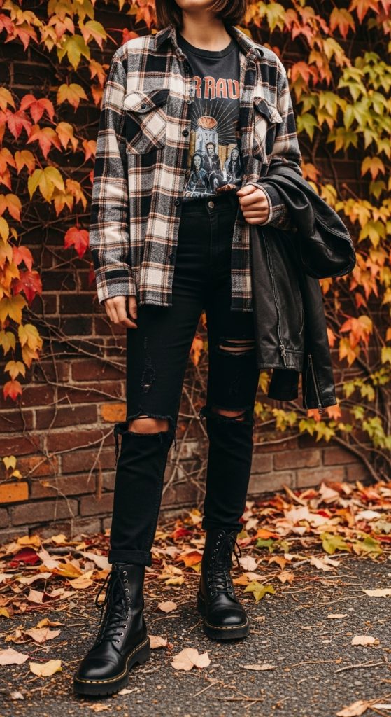 Add a leather jacket for extra warmth and authenticity. The grunge look is ideal for casual outings and perfectly complements fall weather with its layering friendly pieces. It also allows for a relaxed yet expressive style.