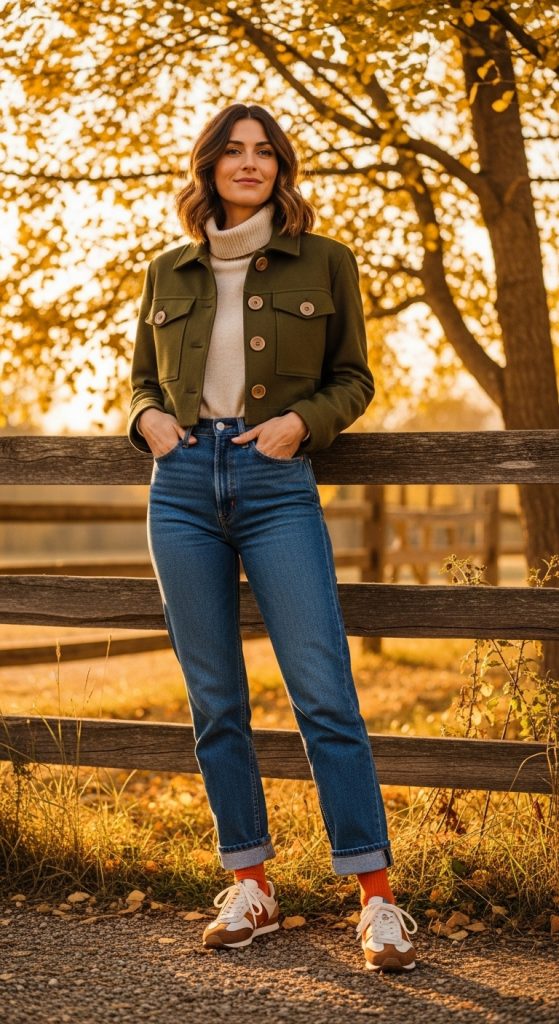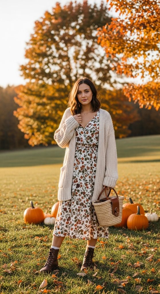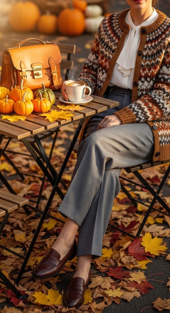 Accessories such as woven baskets, delicate scarves, or vintage jewelry pieces add charm. This outfit evokes a sense of nostalgia and simplicity while being practical for fall. It is perfect for countryside walks, cozy indoor gatherings, or casual weekends.