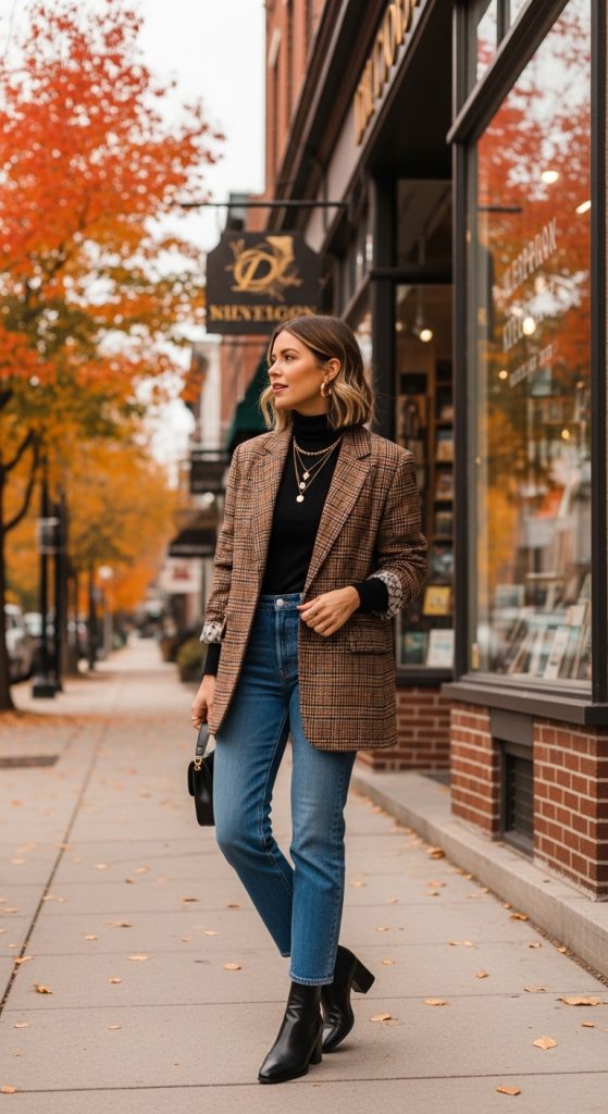 The oversized blazer, popularized in the 1980s, remains a versatile layering piece. For fall, pair a plaid or houndstooth oversized blazer with a turtleneck and straight leg jeans. Add loafers or ankle boots to balance the silhouette.