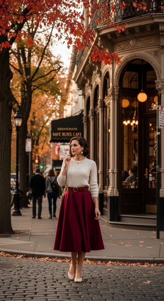 Choose autumnal fabrics like wool or corduroy in shades of burgundy, forest green, or mustard. A vintage brooch or pearl earrings can serve as subtle accessories. This look blends charm with elegance while remaining practical for cooler days.