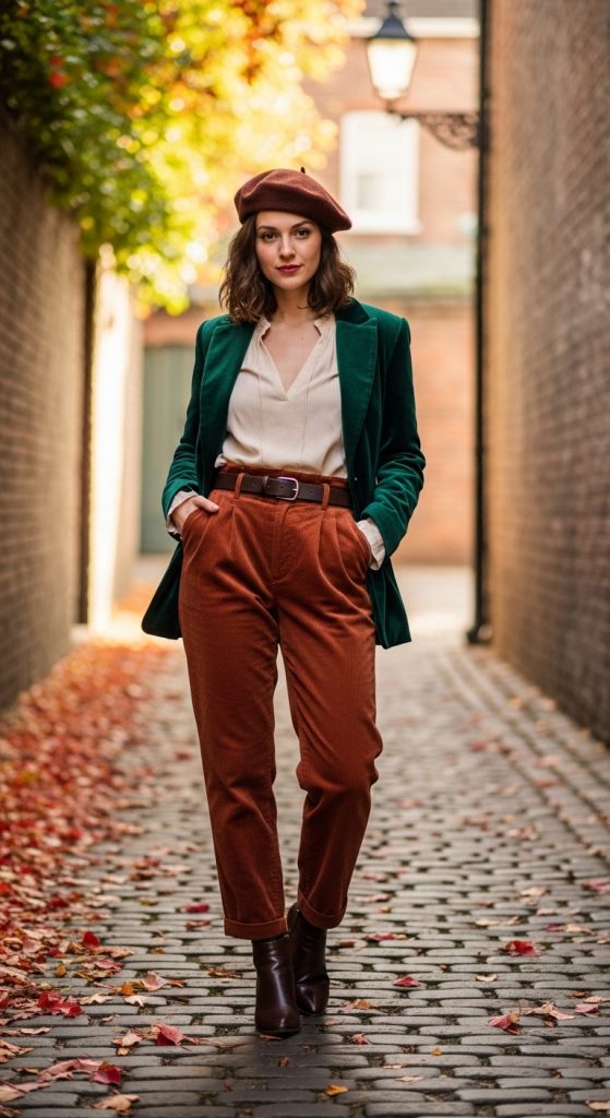 Corduroy and velvet are quintessential fall fabrics that carry a distinctly vintage feel. A corduroy skirt paired with a tucked in blouse and tights, or velvet trousers styled with a knit sweater, creates a richly textured autumn look.
