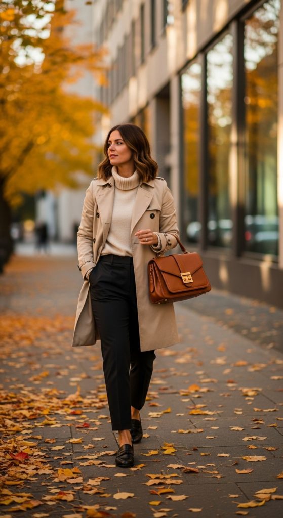 The trench coat has remained a staple across decades, especially from the 1950s onward. For fall, a beige or camel colored trench layered over a turtleneck sweater and tailored trousers creates an effortlessly polished outfit.