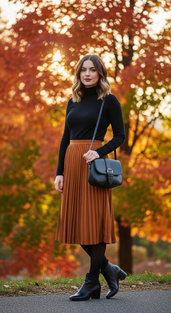 For a casual yet chic look, pair a fitted turtleneck with a midi skirt. Opt for skirts in fall friendly fabrics like corduroy, suede, or pleated satin. A plaid or floral midi skirt also works beautifully with solid turtlenecks in neutral shades.