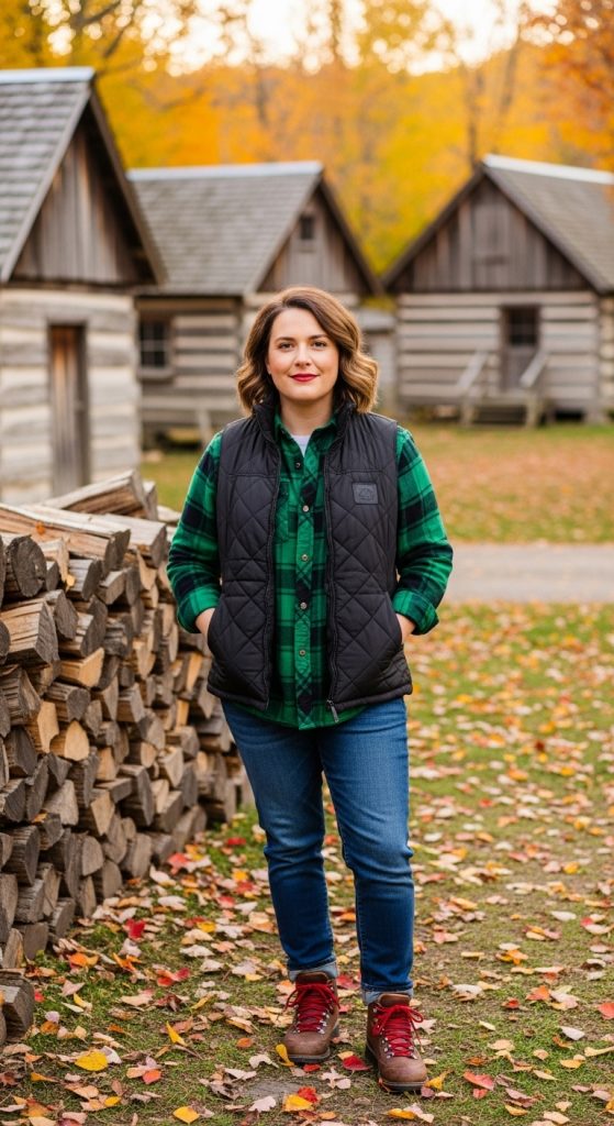 The flannel shirt is a fall essential. Layering it with a puffer vest creates a practical outfit for cooler days. Pair the look with dark wash jeans and hiking boots or rugged sneakers.