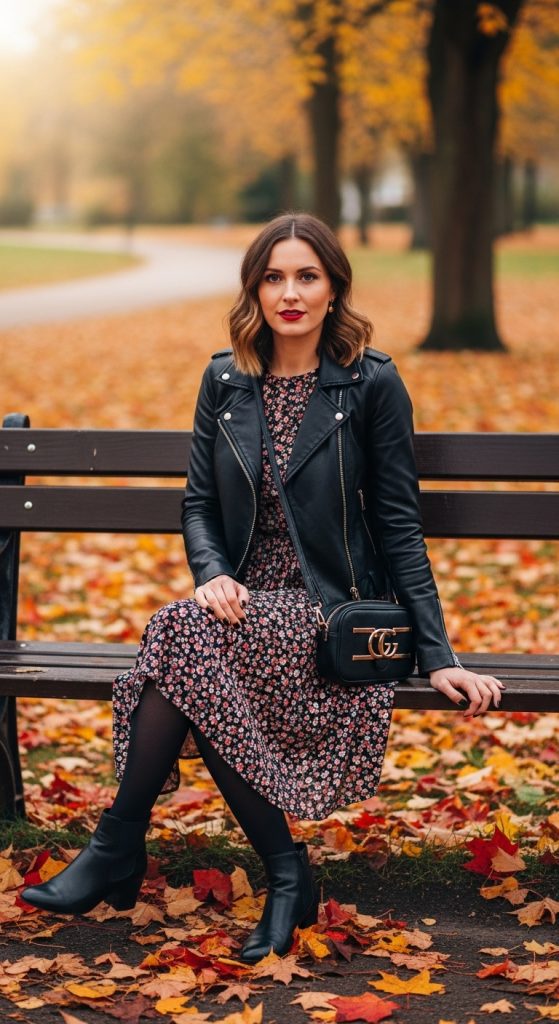 Leather jackets are a fall wardrobe staple. Pair a black or brown leather jacket with a casual dress for an edgy yet effortless look. A floral or plaid dress works especially well when layered with tights and boots.
