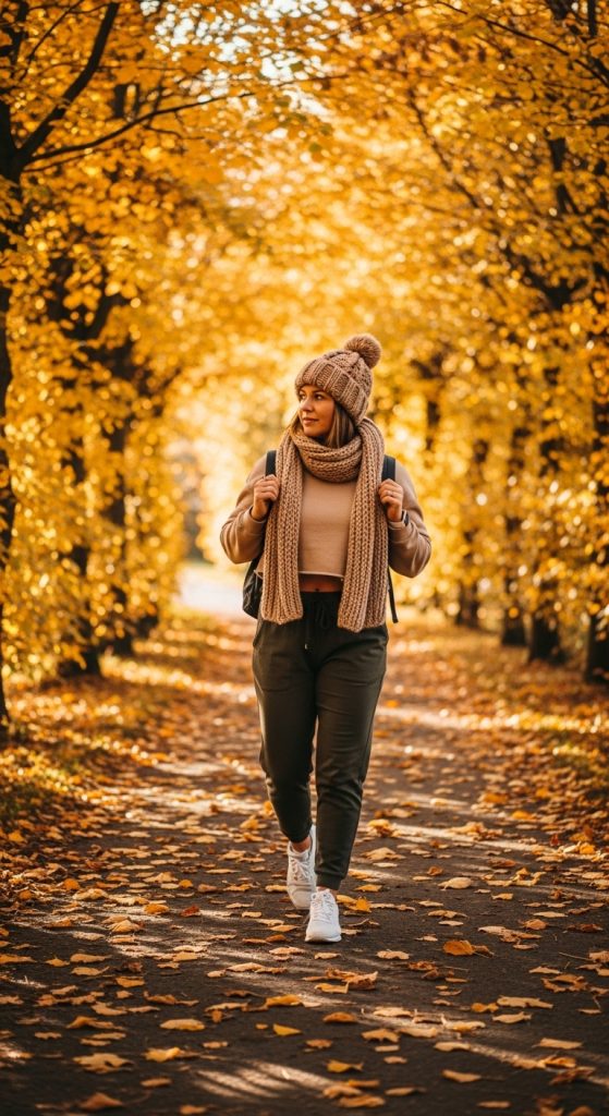 Athleisure outfits are not just for workouts. In fall, combine joggers or leggings with a cropped sweatshirt, long sleeve top, or lightweight jacket. Choose muted autumn tones like olive, rust, and burgundy.