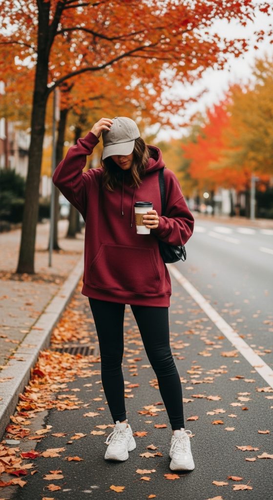For the ultimate casual comfort, oversized hoodies paired with leggings are unbeatable. Choose hoodies in autumnal shades like burnt orange, maroon, or forest green. Black or leather look leggings add a sleek element, making the outfit more stylish.