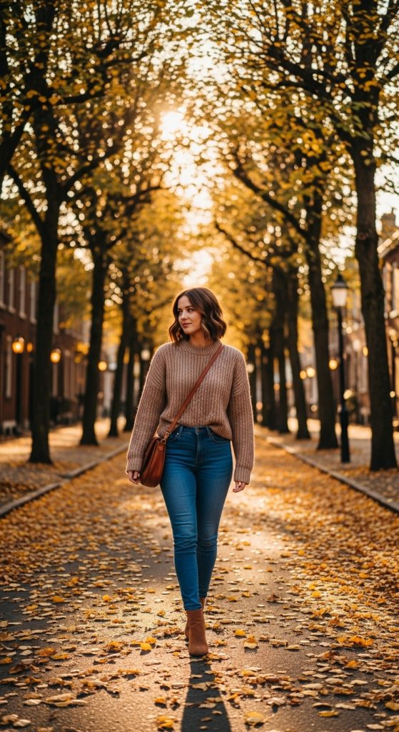 Add neutral accessories like leather boots and a tan bag to complete the outfit. This style is casual, cool, and perfect for fall days when you want something simple but fashionable.