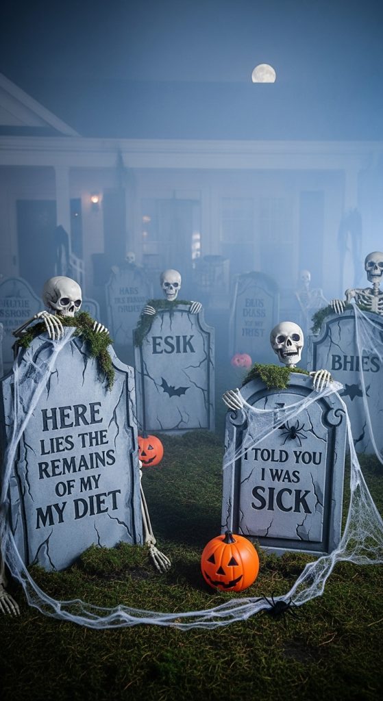 Write humorous or spooky inscriptions such as โRIP,โ โBeware,โ or โHere Lies a Ghostly Soul.โ Add cracks or moss details using paint and sponge techniques. Place the tombstones in your yard or along a walkway, and add skeleton hands or bones peeking out from the ground for added effect.