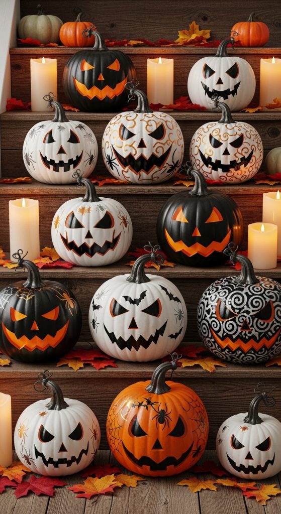 Popular designs include white pumpkins with black spiders, matte black pumpkins with metallic gold accents, or pastel-colored pumpkins with stenciled words like โbooโ or โtrick or treat.โ You can also add glitter, stickers, or fabric to make them unique.